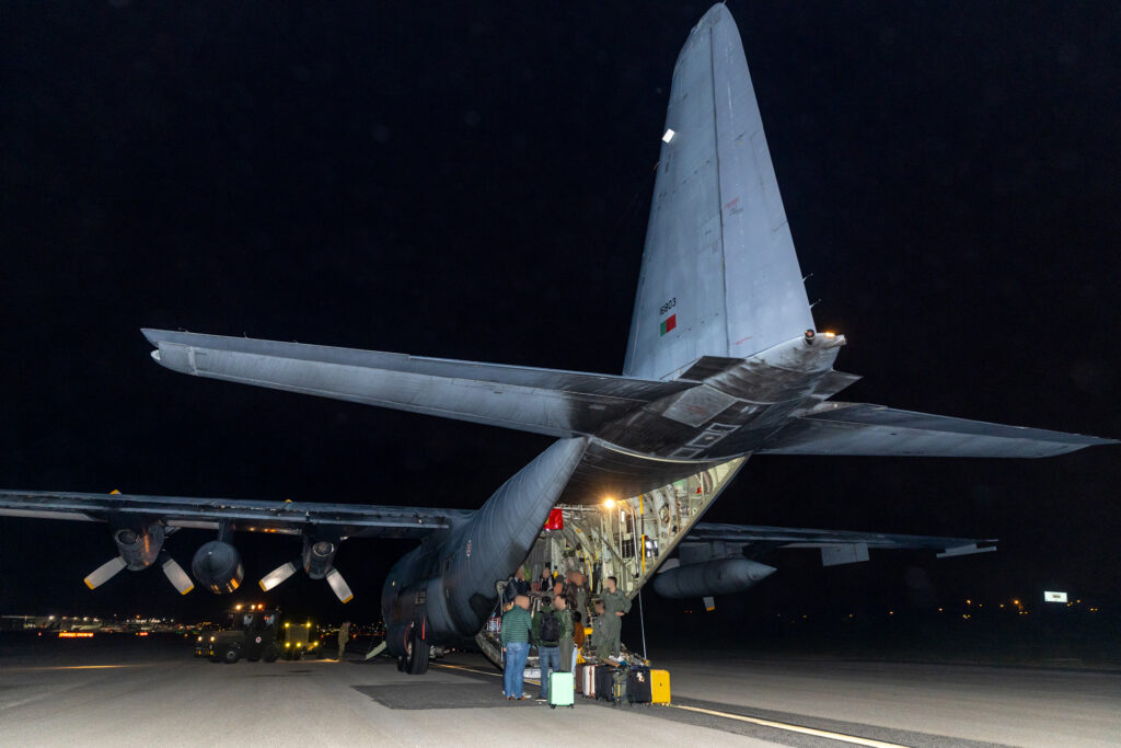 O C-130H aterrou no Aeroporto de Lisboa, na madrugada desta segunda-feira, pelas 05h45, após partir de Riade, na Arábia Saudita.