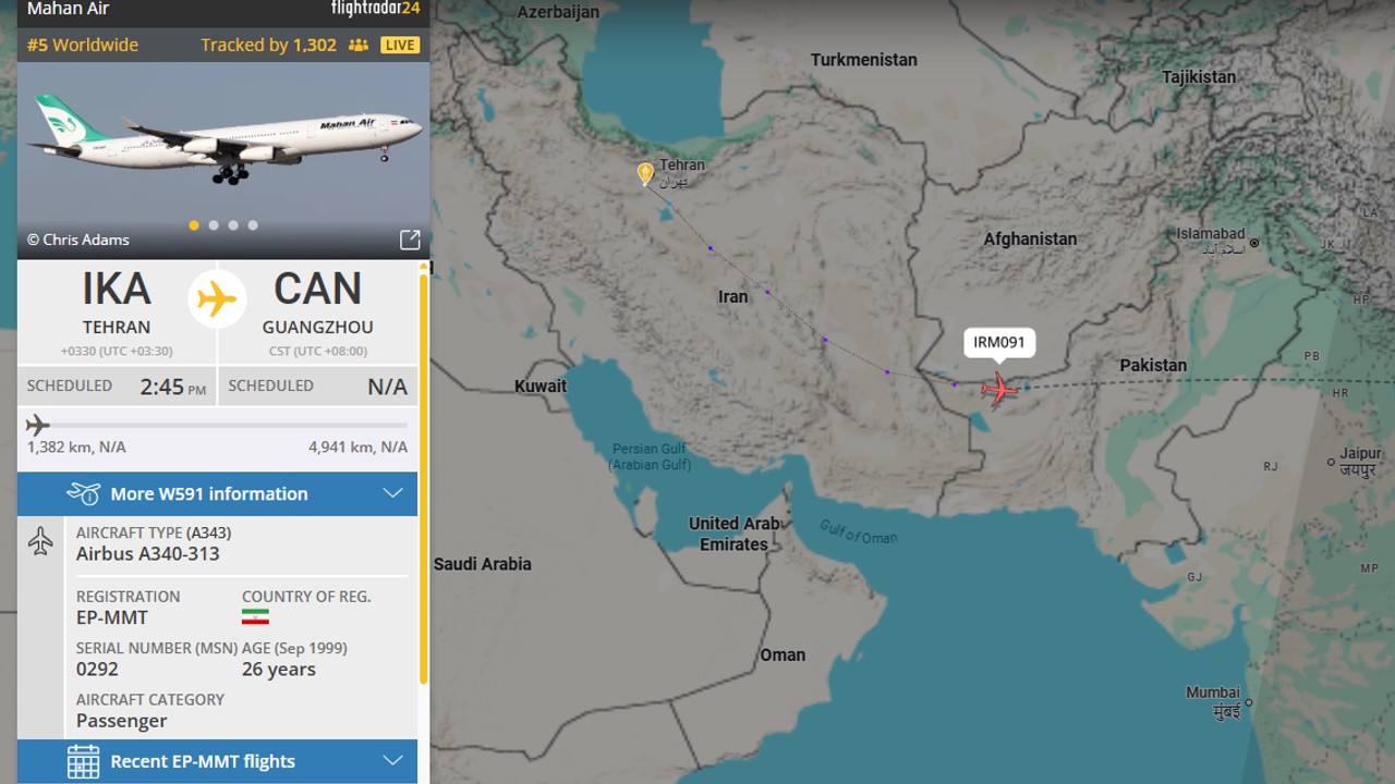 O primeiro voo, IRM091 está, a esta hora, a ser operado pelo A340-300 da Mahan Air e a ligar Teerão a Guangzhou, em Hong Kong.